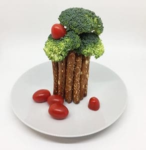 3. Ask them to create a tree with these ingredients by placing the pretzels upright, placing the broccoli and tomatoes on top.